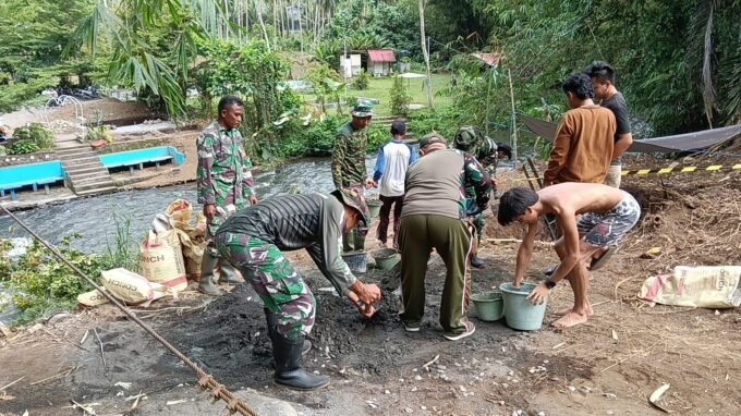 Progres Pesat, TNI dan Warga Rap Rap Gotong Royong Bangun Abutmen Jembatan Perintis Garuda