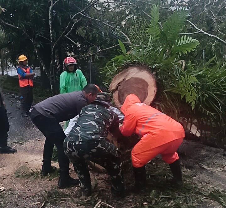 Peristiwa tersebut terjadi akibat hujan deras disertai angin kencang yang melanda kawasan tersebut. Dua pohon berukuran besar tumbang dan melintang di jalan, sehingga menghambat arus lalu lintas serta mengancam keselamatan pengguna jalan.