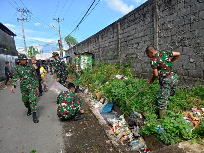 Wujud Kemanunggalan TNI – Rakyat, Kodim 1310/Bitung dan Yonif TP 916/BS bersama Warga Gelar Karya Bakti Pembersihan Kompleks Kanopi Bitung