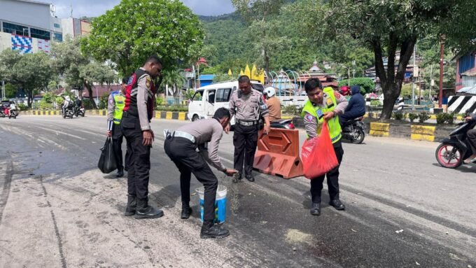 Respon Cepat Operasi Lilin Cartenz 2025, Polisi Amankan Jalan Sam Ratulangi dari Tumpahan Solar