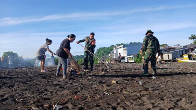 Wujudkan Lingkungan Asri, Koramil 03 Likupang Karya Bakti Bersihkan Pesisir Pantai Desa Likupang Kampung Ambong