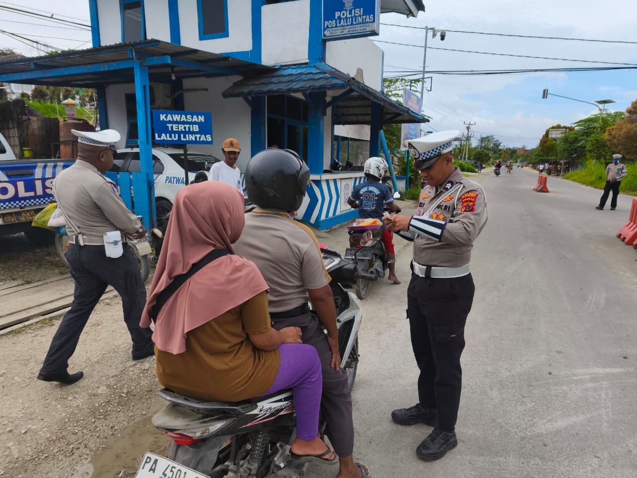 Dalam kegiatan tersebut, personel Sat Lantas melakukan pemeriksaan terhadap para pengendara yang melintas, khususnya kelengkapan kendaraan dan ketertiban berlalu lintas. Selain memberikan edukasi, petugas juga menyampaikan himbauan kamtibmas dan pentingnya mematuhi aturan untuk keselamatan diri maupun pengguna jalan lainnya.