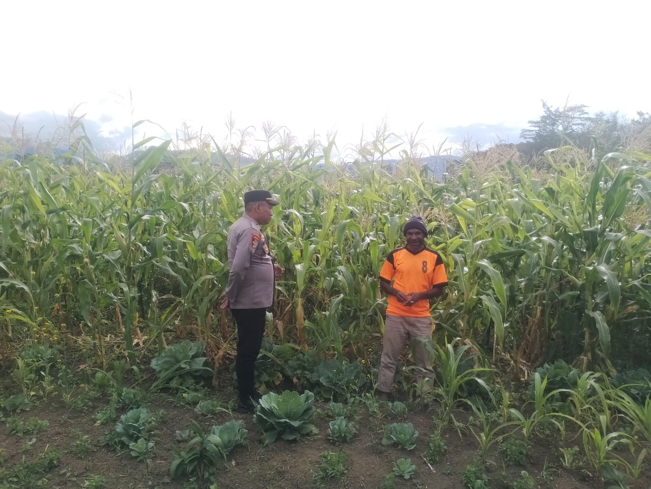 Jayawijaya – Kapolsek Wamena Kota AKP Saharuddin, SH. bersama anggota pada Selasa (25/11/2025) siang, melakukan pengecekan perkembangan tanaman jagung di lahan milik Kepala Kampung Hubikiak Bapak Agus Kosay dengan luas lahan 100 m x 100 m yang ditanami jagung di Kabupaten Jayawijaya, Provinsi Papua Pegunungan. Kegiatan ini bertujuan memastikan tanaman jagung tumbuh dengan baik dan mendukung ketahanan pangan lokal.