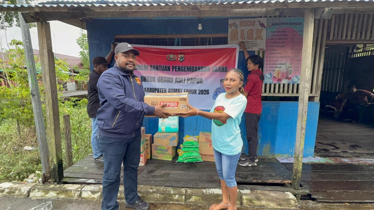 Papua – Kepolisian Resor Asmat terus berkomitmen meningkatkan kesejahteraan masyarakat melalui program pemberdayaan ekonomi bagi Orang Asli Papua (OAP). Hal ini diwujudkan dengan pemberian bantuan pengembangan usaha bagi pelaku Usaha Mikro, Kecil, dan Menengah (UMKM) yang bertempat di Jalan Nusantara 1, Kabupaten Asmat, Kamis (08/01/2026).