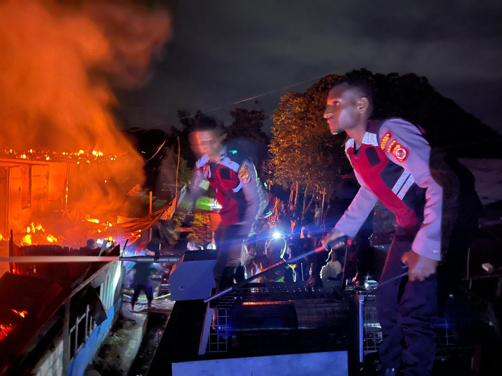Sarmi – Polres Sarmi melalui Pos Shelter sat samapta polres Sarmi bersama personel Polsek Sarmi Kota dengan sigap merespon kejadian kebakaran yang terjadi pada Minggu dini hari sekitar pukul 02.05 WIT di Kampung Sarmo, Distrik Sarmi Kota. Kebakaran tersebut menghanguskan rumah kos milik Bapak Edwin Matadoar yang disewakan kepada Ibu Kartia dan dijadikan kios, serta menjalar ke bangunan di sisi kiri dan kanan.