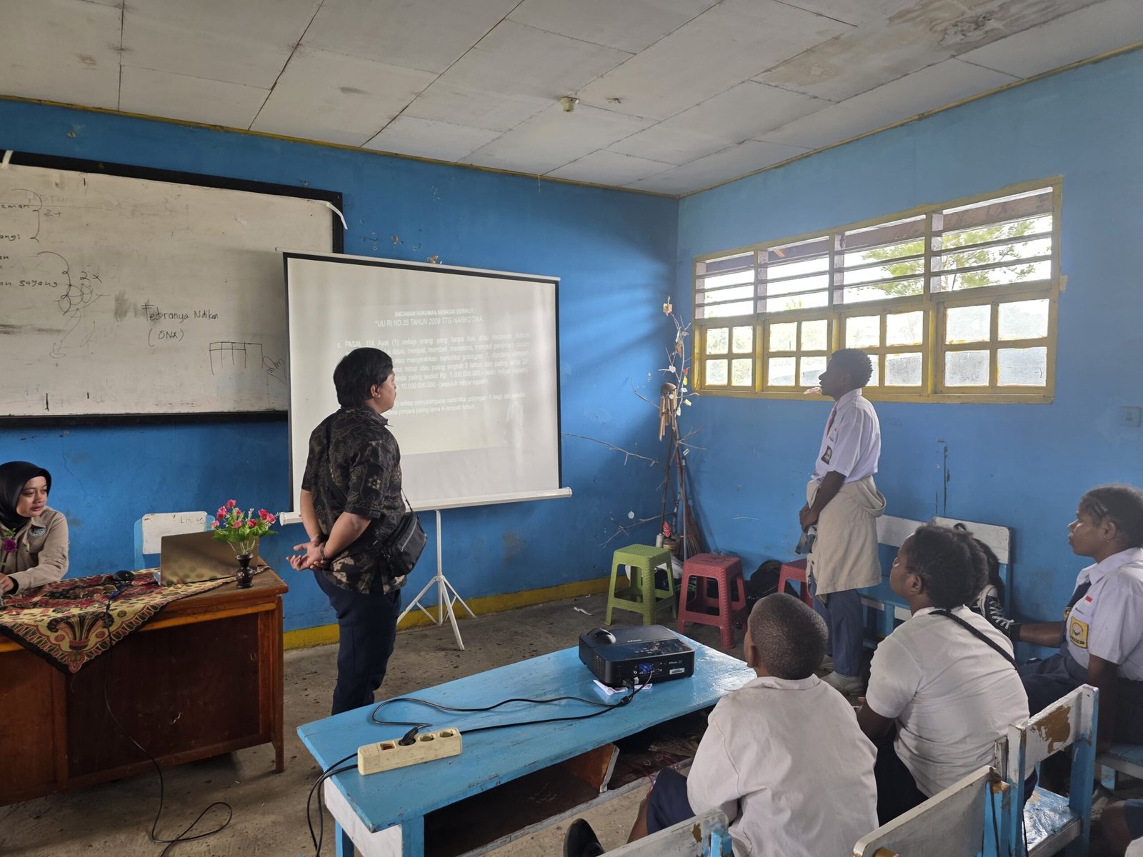 Brigpol Kurnia DJ bersama tim Sat Narkoba tiba pukul 09.20 WIT, di sekolah langsung memberikan materi mengenai dampak buruk penyalahgunaan narkoba bagi kesehatan, masa depan generasi muda, serta pentingnya menanamkan rasa cinta tanah air sejak dini.