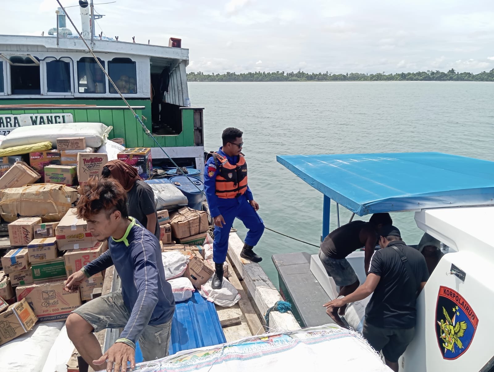 Sarmi – Anggota Satuan Kepolisian Perairan dan Udara (Sat Polairud) Polres Sarmi membantu mengevakuasi sejumlah barang sembako milik warga Mamberamo setelah kapal KLM Segara Wangi yang memuat barang tersebut mengalami kerusakan mesin di wilayah perairan Sarmi. Kamis (04/12/2025).