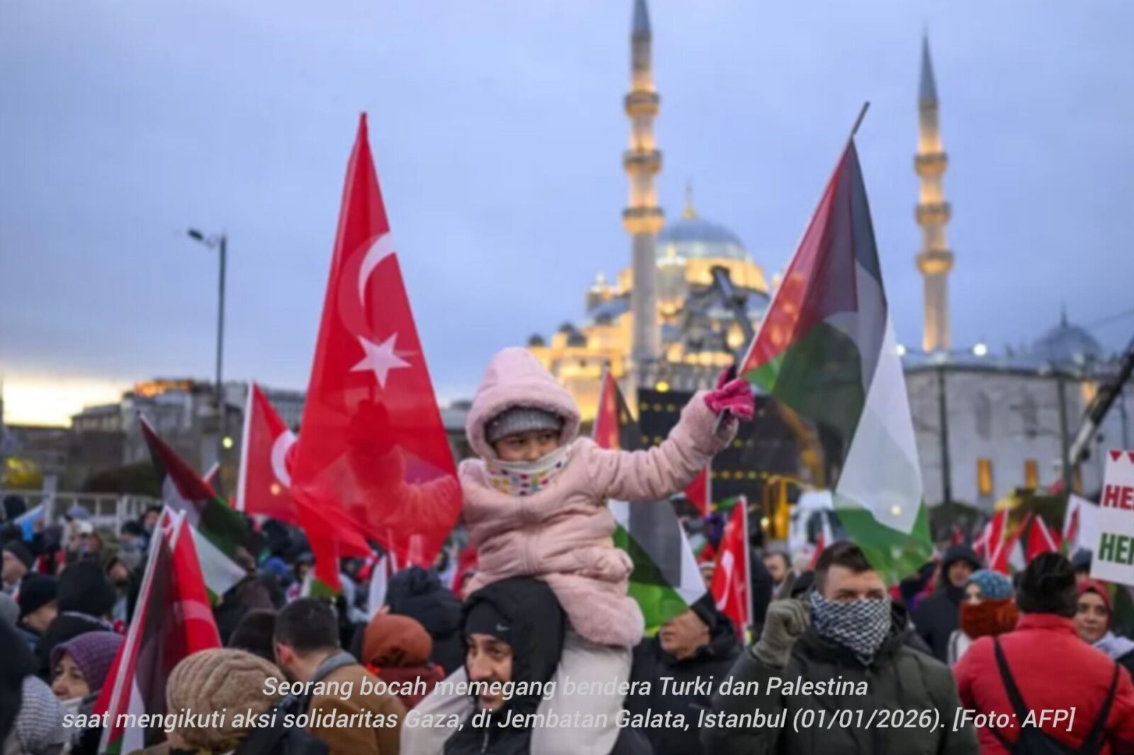 Para demonstran, banyak di antaranya mengibarkan bendera Palestina dan Turki, berkumpul di Jembatan Galata yang bersejarah di kota tersebut pada Kamis (01/01/2026) meskipun cuaca sangat dingin.