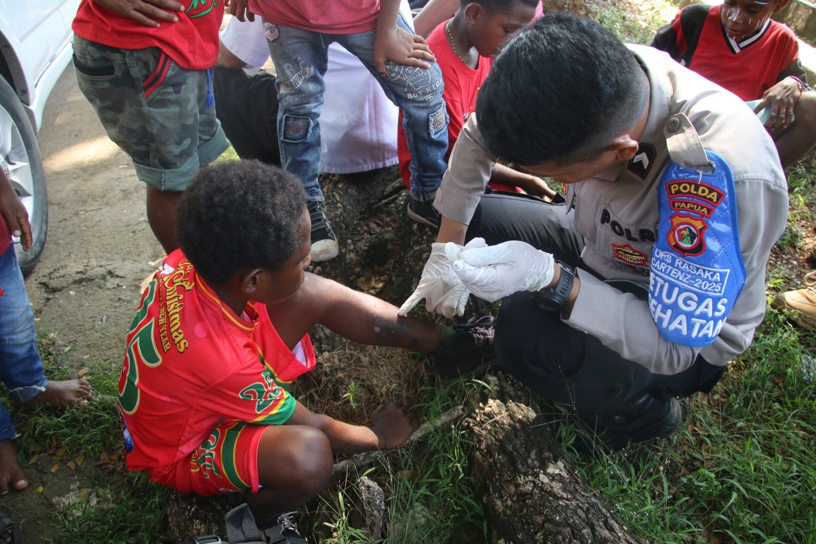 Papua – Subsatgas Keladi Sagu Operasi Rasaka Cartenz, yang dipimpin langsung oleh Kasubsatgas AKP Rozikin, S.H., kembali melaksanakan pelayanan kesehatan bagi masyarakat melalui kegiatan pemeriksaan kesehatan dan pembersihan luka untuk anak-anak di kawasan Gunung Merah, Sentani, Rabu (10/12/2025).